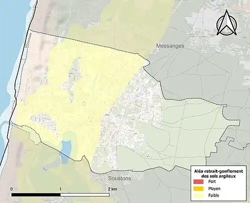 Le retrait-gonflement des sols argileux est susceptible d'engendrer des dommages importants aux bâtiments en cas d’alternance de périodes de sécheresse et de pluie. Aucune partie du territoire de la commune n'est en aléa moyen ou fort (19,2 % au niveau départemental et 48,5 % au niveau national). Sur les 1 792 bâtiments dénombrés sur la commune en 2019, aucun n'est en aléa moyen ou fort, à comparer aux 17 % au niveau départemental et 54 % au niveau national. Une cartographie de l'exposition du territoire national au retrait gonflement des sols argileux est disponible sur le site du BRGM[22],[Carte 2].