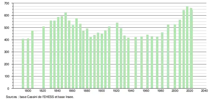 L'évolution du nombre d'habitants est connue à travers les recensements de la population effectués dans la commune depuis 1793. Pour les communes de moins de 10 000 habitants, une enquête de recensement portant sur toute la population est réalisée tous les cinq ans, les populations de référence des années intermédiaires étant quant à elles estimées par interpolation ou extrapolation[19]. Pour la commune, le premier recensement exhaustif entrant dans le cadre du nouveau dispositif a été réalisé en 2006[20].