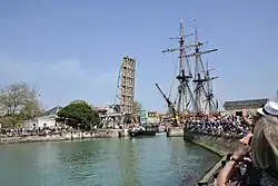 La frégate Hermione sortant du bassin des chalutiers pour accéder au chenal.- Catamarans de tourisme, du bassin des chalutiers.