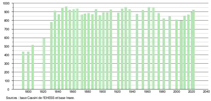 L'évolution du nombre d'habitants est connue à travers les recensements de la population effectués dans la commune depuis 1793. Pour les communes de moins de 10 000 habitants, une enquête de recensement portant sur toute la population est réalisée tous les cinq ans, les populations de référence des années intermédiaires étant quant à elles estimées par interpolation ou extrapolation[24]. Pour la commune, le premier recensement exhaustif entrant dans le cadre du nouveau dispositif a été réalisé en 2005[25].