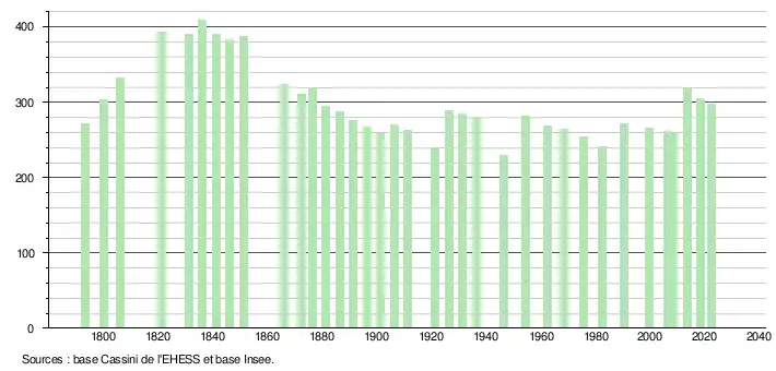 L'évolution du nombre d'habitants est connue à travers les recensements de la population effectués dans la commune depuis 1793. Pour les communes de moins de 10 000 habitants, une enquête de recensement portant sur toute la population est réalisée tous les cinq ans, les populations de référence des années intermédiaires étant quant à elles estimées par interpolation ou extrapolation[24]. Pour la commune, le premier recensement exhaustif entrant dans le cadre du nouveau dispositif a été réalisé en 2008[25].