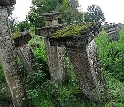 Les pierres tombales, pour la plupart en forme de stèles, datent de la première moitié et du milieu du XIXe siècle et sont constituées de grès[2] ; certaines d'entre elles, notamment celles qui prennent la forme d'un pied surmonté d'une sorte de chapeau, sont partiellement endommagées[2].