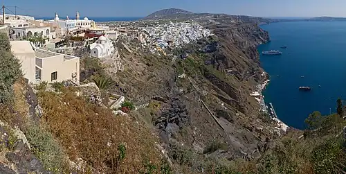 Le nouveau port de Santorin (ou port d’Athinios ou port de Thira) est inauguré dans les années 1970, à 8 km au sud, pour accueillir les ferries, bateaux de croisière et navires de commerce[4].