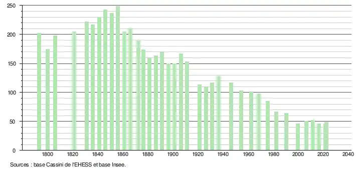 | L'évolution du nombre d'habitants est connue à travers les recensements de la population effectués dans la commune depuis 1793. Pour les communes de moins de 10 000 habitants, une enquête de recensement portant sur toute la population est réalisée tous les cinq ans, les populations de référence des années intermédiaires étant quant à elles estimées par interpolation ou extrapolation[25]. Pour la commune, le premier recensement exhaustif entrant dans le cadre du nouveau dispositif a été réalisé en 2006[26]. En 2022, la commune comptait 49 habitants[Note 3], en évolution de +6,52 % par rapport à 2016 (Hautes-Pyrénées : +1,59 %, France hors Mayotte : +2,11 %). |