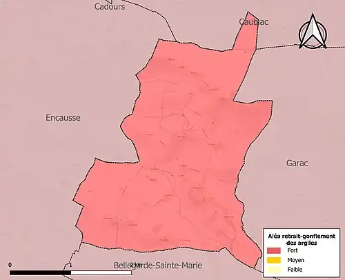 Le retrait-gonflement des sols argileux est susceptible d'engendrer des dommages importants aux bâtiments en cas d’alternance de périodes de sécheresse et de pluie. La totalité de la commune est en aléa moyen ou fort (88,8 % au niveau départemental et 48,5 % au niveau national). Sur les 65 bâtiments dénombrés sur la commune en 2019, 65 sont en aléa moyen ou fort, soit 100 %, à comparer aux 98 % au niveau départemental et 54 % au niveau national. Une cartographie de l'exposition du territoire national au retrait gonflement des sols argileux est disponible sur le site du BRGM[23],[Carte 1].