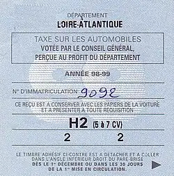 - ↑ « Arrêté du 9 octobre 2001 portant modification des articles 155 C et 155 H de l'annexe IV au code général des impôts et supprimant la délivrance et l'apposition du timbre adhésif pour paiement de la taxe différentielle sur les véhicules à moteur. », sur www.legifrance.gouv.fr, (consulté le )