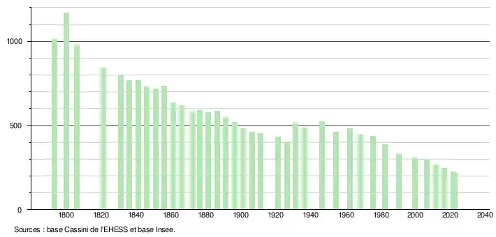 L'évolution du nombre d'habitants est connue à travers les recensements de la population effectués dans la commune depuis 1793. Pour les communes de moins de 10 000 habitants, une enquête de recensement portant sur toute la population est réalisée tous les cinq ans, les populations de référence des années intermédiaires étant quant à elles estimées par interpolation ou extrapolation[16]. Pour la commune, le premier recensement exhaustif entrant dans le cadre du nouveau dispositif a été réalisé en 2006[17].