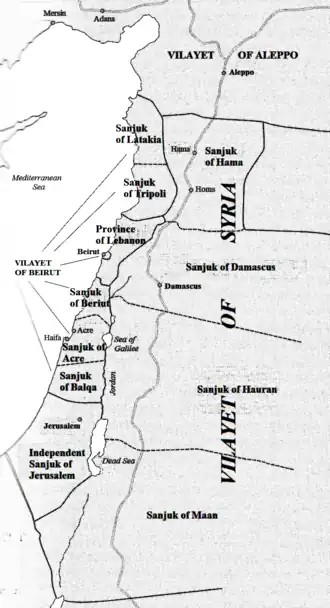 En 1872, les sandjaks d'Acre et Naplouse sont rattachés pendant deux mois à la province de Jérusalem mais Jérusalem redevient ensuite un sandjak séparé dépendant directement de Constantinople.