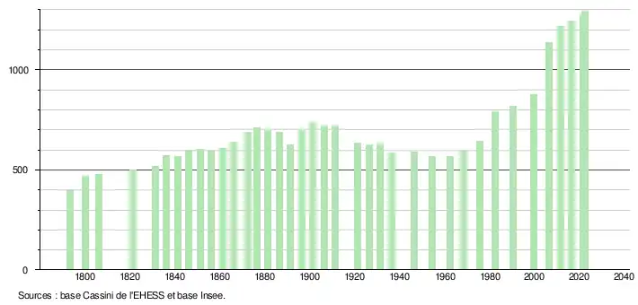 L'évolution du nombre d'habitants est connue à travers les recensements de la population effectués dans la commune depuis 1793. Pour les communes de moins de 10 000 habitants, une enquête de recensement portant sur toute la population est réalisée tous les cinq ans, les populations de référence des années intermédiaires étant quant à elles estimées par interpolation ou extrapolation[23]. Pour la commune, le premier recensement exhaustif entrant dans le cadre du nouveau dispositif a été réalisé en 2006[24].