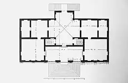 Pour les plans de la villa, Palladio doit avant tout tenir compte de la nécessité d'intégrer dans un ensemble contemporain et cohérent une maison préexistante avec des tours, citée dans les documents et encore bien visible à l'angle droit de l'édifice réalisé. Palladio la redessine à l’autre extrémité du plan, en créant deux appartements symétriques de trois pièces chacun, reliés, par une loggia à la voûte en berceau, à la grande salle à voûte d'arêtes.
