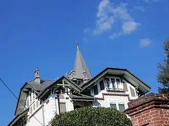 Les façades, caracterisées par une prononcée asymmmetrie volumétrique, présentent une équilibrée combinaison des matériaux qui parvient à donner une forte cohésion stylistique au bâtiment. L'élément distinctif de la villa est sa petite tour surmontée par une élancée toiture conique[1].