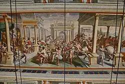 Les décorations extérieures originales tendent à donner à la structure un caractère bien défini en harmonie avec les intérieurs finement décorés de fresques du peintre Luca Cambiaso qui, dans la salle principale, a représenté l'Histoire des Sabines avec une extrême vigueur visionnaire. La fresque qui recouvre entièrement la grande voûte a été peinte vers 1565 alors que Cambiaso était au sommet de sa carrière, considéré comme le décorateur le plus célèbre des demeures génoises. Le thème est tiré de l'Histoire de Rome, de Tite-Live. L'épisode choisi pour le panneau central est l'Enlèvement des Sabines : Romulus, de son trône, représenté à gauche, se lève pour donner le signal convenu qui donne lieu au déchaînement des Romains sur les filles des Sabins. Le récit est complété par six autres panneaux qui racontent la suite de l'histoire : La rencontre de Tarpeia avec Titus Tatius, au cours de laquelle la vestale, fille du commandant de la citadelle du Capitole, fut corrompue à l'or par le roi sabin. Le meurtre de Tarpea suit, qui trahit les Romains en permettant aux Sabins de prendre d'assaut la citadelle. Alors les Sabines, se plaçant entre leurs pères et leurs maris, c'est-à-dire les Sabins et les Romains, mettent fin à la guerre et font l'alliance entre les deux peuples. L'histoire s'achève par l'Ascension au Ciel de Romulus et le Couronnement de Numa Pompilius, deuxième roi de Rome, d'origine sabine. Dans les angles, le décor est complété par des Allégories des Arts et des Sciences, représentées avec un illusionnisme de perspective, alternées avec des cariatides peintes. Contrairement aux œuvres précédentes de Cambiaso, ici aucune partie n'est réalisée en stuc, tandis que les cadres et les fausses architectures sont également peints. L'œuvre a immédiatement acquis une renommée notable et a été définie par Anton Raphael Mengs comme la plus Raphaëlesque de Gênes[1].