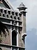 Le bâtiment, qui prèsente un style néogothique, a un plan de forme quadrangulaire, agrémenté de deux tours sur la façade ouest, l'une d'entre elles étant surmontée d'une flèche[2].
