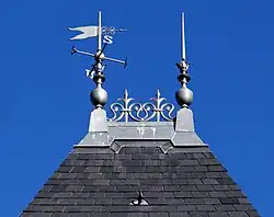 Des appareillages losangés en briques et autres éléments de modénatures en plâtre décorent les façades. La tour carrée en semi hors-œuvre comporte en son dernier étage une structure en pans de bois, avec remplissage en maçonnerie enduite au plâtre. Sa couverture en ardoise, restaurée en automne 2015, comporte deux épis de faîtage, reliés par un feston en zinc, et ornés d’une girouette (reconstitution d'après les originaux).