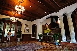La décoration s'inspire aussi d'éléments chinois, en particulier deux lions à la porte d'entrée et des antiquités chinoises. Les chambres sont décorées en utilisant notamment des modèles et des dessins chinois[2].