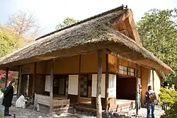- ↑ Couverture de bardeaux : chaque planchette est fixée au lattis avec un clou de bambou. Ces bardeaux sont en planchettes de cyprès sawara de 4 à 5 mm d'épaisseur. Chaque planchette recouvre la précédente sur environ les 8/10 de sa longueur, ce qui ne laisse découverte qu’une surface de 2 à 4 cm. Elles ont été fendues à la hache, ce qui leur donne cet aspect irrégulier, en harmonie avec la nature environnante.
