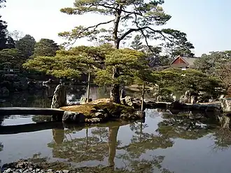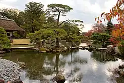 Vue sur la demeure et l'étang depuis le Shōkatei.