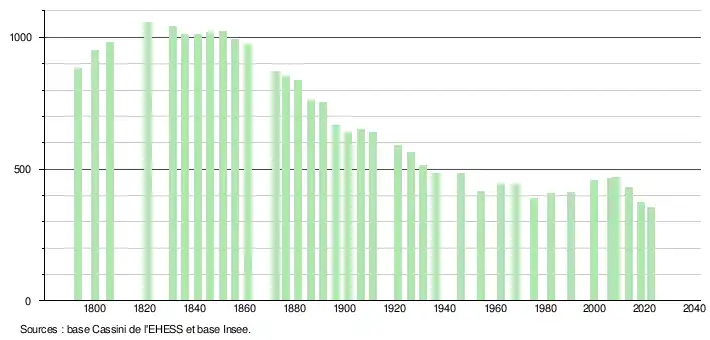 L'évolution du nombre d'habitants est connue à travers les recensements de la population effectués dans la commune depuis 1793. Pour les communes de moins de 10 000 habitants, une enquête de recensement portant sur toute la population est réalisée tous les cinq ans, les populations de référence des années intermédiaires étant quant à elles estimées par interpolation ou extrapolation[17]. Pour la commune, le premier recensement exhaustif entrant dans le cadre du nouveau dispositif a été réalisé en 2008[18].