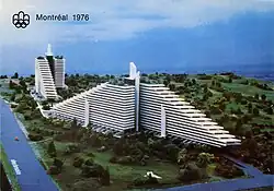 Le village olympique de Montréal pour les Jeux olympiques d'été de 1976 se situe rue Sherbrooke dans le quartier Rosemont–La Petite-Patrie de Montréal[5], à 800 mètres au nord-ouest du stade olympique[5]. Il est conçu par Roger D'Astous et Luc Durand[5]. Le quartier fait office de barrière entre un grand parc de verdure ouvert aux athlètes et la rue Sherbrooke avec le parc olympique[5]. Il est construit tout en béton afin d'être harmonisé avec le parc olympique voisin[6].