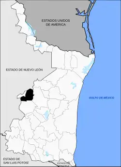 Elle est limitrophe au nord, dans l'État de Nuevo León, de la municipalité de Linares, à l'ouest, dans l'État de Tamaulipas, de celle de Mainero, puis dans l'État de Nuevo León, de celle d'Aramberri, au sud, à nouveau dans l'État de Tamaulipas, de celle d'Hidalgo, et à l'est de celle de San Carlos[1].