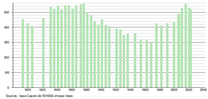 L'évolution du nombre d'habitants est connue à travers les recensements de la population effectués dans la commune depuis 1793. Pour les communes de moins de 10 000 habitants, une enquête de recensement portant sur toute la population est réalisée tous les cinq ans, les populations de référence des années intermédiaires étant quant à elles estimées par interpolation ou extrapolation[19]. Pour la commune, le premier recensement exhaustif entrant dans le cadre du nouveau dispositif a été réalisé en 2005[20].