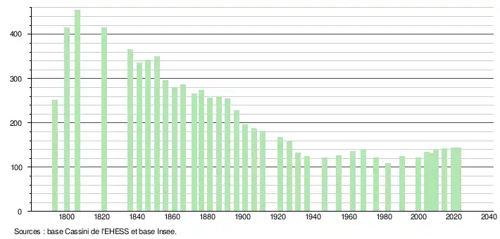 L'évolution du nombre d'habitants est connue à travers les recensements de la population effectués dans la commune depuis 1793. Pour les communes de moins de 10 000 habitants, une enquête de recensement portant sur toute la population est réalisée tous les cinq ans, les populations de référence des années intermédiaires étant quant à elles estimées par interpolation ou extrapolation[12]. Pour la commune, le premier recensement exhaustif entrant dans le cadre du nouveau dispositif a été réalisé en 2004[13].