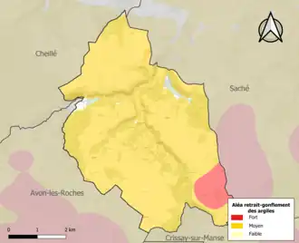 La commune est vulnérable au risque de mouvements de terrains constitué principalement du retrait-gonflement des sols argileux[22]. Cet aléa est susceptible d'engendrer des dommages importants aux bâtiments en cas d’alternance de périodes de sécheresse et de pluie. 98,4 % de la superficie communale est en aléa moyen ou fort (90,2 % au niveau départemental et 48,5 % au niveau national). Sur les 542 bâtiments dénombrés sur la commune en 2019, 542 sont en aléa moyen ou fort, soit 100 %, à comparer aux 91 % au niveau départemental et 54 % au niveau national. Une cartographie de l'exposition du territoire national au retrait gonflement des sols argileux est disponible sur le site du BRGM[23],[24].