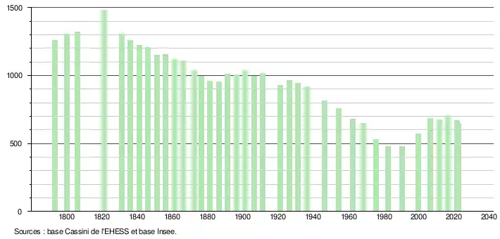 L'évolution du nombre d'habitants est connue à travers les recensements de la population effectués dans la commune depuis 1793. Pour les communes de moins de 10 000 habitants, une enquête de recensement portant sur toute la population est réalisée tous les cinq ans, les populations de référence des années intermédiaires étant quant à elles estimées par interpolation ou extrapolation[16]. Pour la commune, le premier recensement exhaustif entrant dans le cadre du nouveau dispositif a été réalisé en 2006[17].