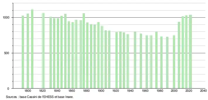 L'évolution du nombre d'habitants est connue à travers les recensements de la population effectués dans la commune depuis 1793. Pour les communes de moins de 10 000 habitants, une enquête de recensement portant sur toute la population est réalisée tous les cinq ans, les populations de référence des années intermédiaires étant quant à elles estimées par interpolation ou extrapolation[26]. Pour la commune, le premier recensement exhaustif entrant dans le cadre du nouveau dispositif a été réalisé en 2006[27].