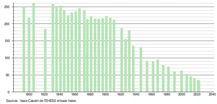 L'évolution du nombre d'habitants est connue à travers les recensements de la population effectués dans la commune depuis 1793. Pour les communes de moins de 10 000 habitants, une enquête de recensement portant sur toute la population est réalisée tous les cinq ans, les populations de référence des années intermédiaires étant quant à elles estimées par interpolation ou extrapolation[17]. Pour la commune, le premier recensement exhaustif entrant dans le cadre du nouveau dispositif a été réalisé en 2006[18].