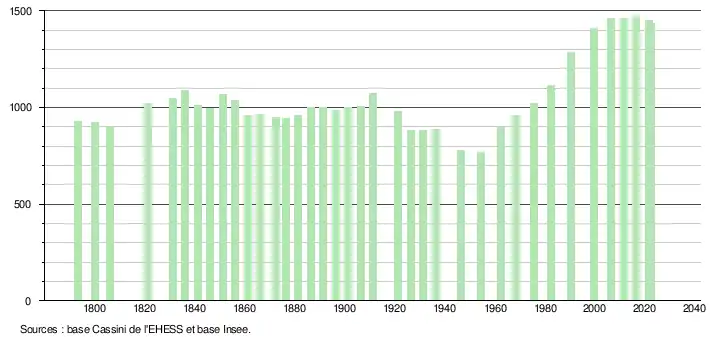 L'évolution du nombre d'habitants est connue à travers les recensements de la population effectués dans la commune depuis 1793. Pour les communes de moins de 10 000 habitants, une enquête de recensement portant sur toute la population est réalisée tous les cinq ans, les populations de référence des années intermédiaires étant quant à elles estimées par interpolation ou extrapolation[18]. Pour la commune, le premier recensement exhaustif entrant dans le cadre du nouveau dispositif a été réalisé en 2006[19].