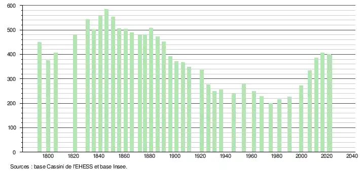 L'évolution du nombre d'habitants est connue à travers les recensements de la population effectués dans la commune depuis 1793. Pour les communes de moins de 10 000 habitants, une enquête de recensement portant sur toute la population est réalisée tous les cinq ans, les populations de référence des années intermédiaires étant quant à elles estimées par interpolation ou extrapolation[15]. Pour la commune, le premier recensement exhaustif entrant dans le cadre du nouveau dispositif a été réalisé en 2006[16].