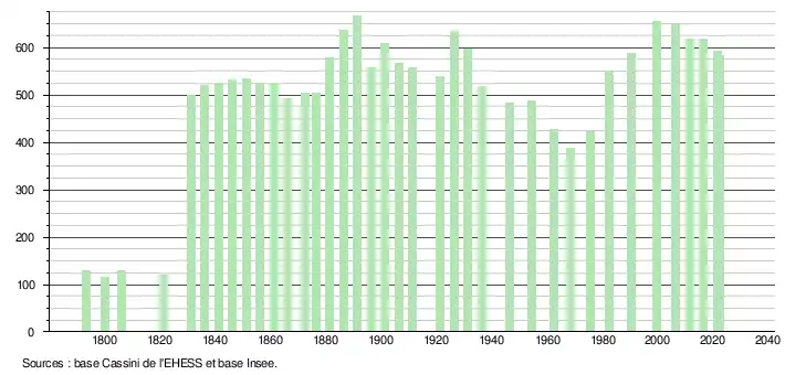 L'évolution du nombre d'habitants est connue à travers les recensements de la population effectués dans la commune depuis 1793. Pour les communes de moins de 10 000 habitants, une enquête de recensement portant sur toute la population est réalisée tous les cinq ans, les populations de référence des années intermédiaires étant quant à elles estimées par interpolation ou extrapolation[16]. Pour la commune, le premier recensement exhaustif entrant dans le cadre du nouveau dispositif a été réalisé en 2006[17].