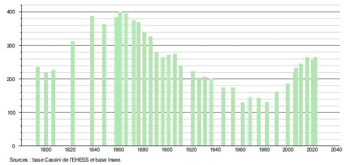 L'évolution du nombre d'habitants est connue à travers les recensements de la population effectués dans la commune depuis 1793. Pour les communes de moins de 10 000 habitants, une enquête de recensement portant sur toute la population est réalisée tous les cinq ans, les populations de référence des années intermédiaires étant quant à elles estimées par interpolation ou extrapolation[8]. Pour la commune, le premier recensement exhaustif entrant dans le cadre du nouveau dispositif a été réalisé en 2005[9].