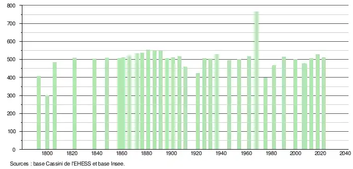 L'évolution du nombre d'habitants est connue à travers les recensements de la population effectués dans la commune depuis 1793. Pour les communes de moins de 10 000 habitants, une enquête de recensement portant sur toute la population est réalisée tous les cinq ans, les populations de référence des années intermédiaires étant quant à elles estimées par interpolation ou extrapolation[8]. Pour la commune, le premier recensement exhaustif entrant dans le cadre du nouveau dispositif a été réalisé en 2007[9].