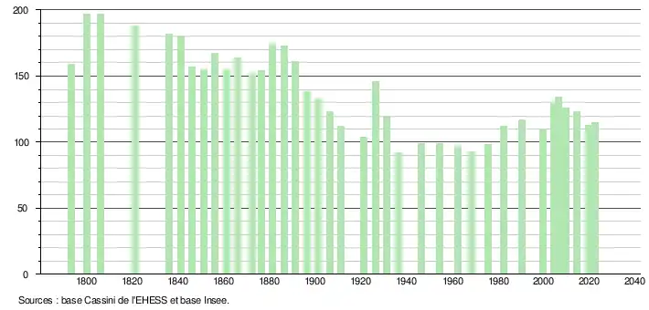 L'évolution du nombre d'habitants est connue à travers les recensements de la population effectués dans la commune depuis 1793. Pour les communes de moins de 10 000 habitants, une enquête de recensement portant sur toute la population est réalisée tous les cinq ans, les populations de référence des années intermédiaires étant quant à elles estimées par interpolation ou extrapolation[28]. Pour la commune, le premier recensement exhaustif entrant dans le cadre du nouveau dispositif a été réalisé en 2004[29].