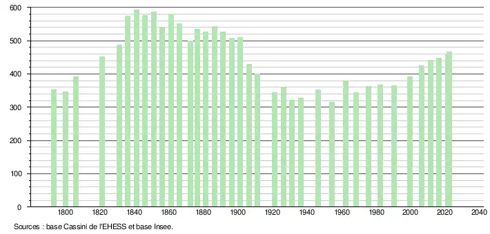 L'évolution du nombre d'habitants est connue à travers les recensements de la population effectués dans la commune depuis 1793. Pour les communes de moins de 10 000 habitants, une enquête de recensement portant sur toute la population est réalisée tous les cinq ans, les populations de référence des années intermédiaires étant quant à elles estimées par interpolation ou extrapolation[18]. Pour la commune, le premier recensement exhaustif entrant dans le cadre du nouveau dispositif a été réalisé en 2006[19].