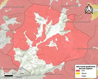 Les mouvements de terrains susceptibles de se produire sur la commune sont des affaissements et effondrements liés aux cavités souterraines (hors mines) et des tassements différentiels[37]. Afin de mieux appréhender le risque d’affaissement de terrain, un inventaire national permet de localiser les éventuelles cavités souterraines sur la commune[38]. Le retrait-gonflement des sols argileux est susceptible d'engendrer des dommages importants aux bâtiments en cas d’alternance de périodes de sécheresse et de pluie[39]. 66,9 % de la superficie communale est en aléa moyen ou fort (58,6 % au niveau départemental et 48,5 % au niveau national métropolitain)[Carte 4]. Depuis le , en application de la loi ÉLAN, différentes contraintes s'imposent aux vendeurs, maîtres d'ouvrages ou constructeurs de biens situés dans une zone classée en aléa moyen ou fort[Note 3],[40].