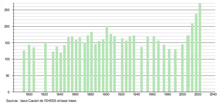 | L'évolution du nombre d'habitants est connue à travers les recensements de la population effectués dans la commune depuis 1793. Pour les communes de moins de 10 000 habitants, une enquête de recensement portant sur toute la population est réalisée tous les cinq ans, les populations de référence des années intermédiaires étant quant à elles estimées par interpolation ou extrapolation[23]. Pour la commune, le premier recensement exhaustif entrant dans le cadre du nouveau dispositif a été réalisé en 2007[24]. En 2022, la commune comptait 270 habitants[Note 3], en évolution de +15,88 % par rapport à 2016 (Aude : +2,65 %, France hors Mayotte : +2,11 %). |