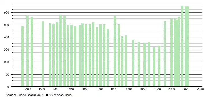 L'évolution du nombre d'habitants est connue à travers les recensements de la population effectués dans la commune depuis 1793. Pour les communes de moins de 10 000 habitants, une enquête de recensement portant sur toute la population est réalisée tous les cinq ans, les populations de référence des années intermédiaires étant quant à elles estimées par interpolation ou extrapolation[37]. Pour la commune, le premier recensement exhaustif entrant dans le cadre du nouveau dispositif a été réalisé en 2004[38].