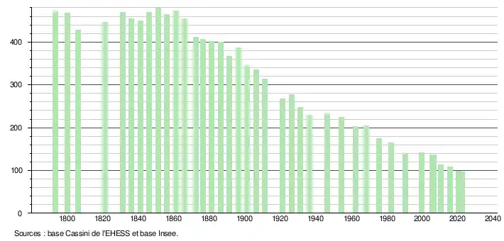L'évolution du nombre d'habitants est connue à travers les recensements de la population effectués dans la commune depuis 1793. Pour les communes de moins de 10 000 habitants, une enquête de recensement portant sur toute la population est réalisée tous les cinq ans, les populations de référence des années intermédiaires étant quant à elles estimées par interpolation ou extrapolation[17]. Pour la commune, le premier recensement exhaustif entrant dans le cadre du nouveau dispositif a été réalisé en 2005[18].