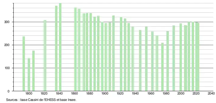 L'évolution du nombre d'habitants est connue à travers les recensements de la population effectués dans la commune depuis 1793. Pour les communes de moins de 10 000 habitants, une enquête de recensement portant sur toute la population est réalisée tous les cinq ans, les populations de référence des années intermédiaires étant quant à elles estimées par interpolation ou extrapolation[27]. Pour la commune, le premier recensement exhaustif entrant dans le cadre du nouveau dispositif a été réalisé en 2005[28].