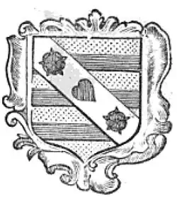 Blason | D'or à trois fasces d'azur à la bande d'argent chargée d'un cœur de gueules entre deux roses de même. |