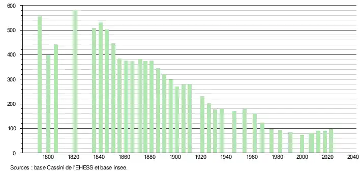L'évolution du nombre d'habitants est connue à travers les recensements de la population effectués dans la commune depuis 1793. Pour les communes de moins de 10 000 habitants, une enquête de recensement portant sur toute la population est réalisée tous les cinq ans, les populations de référence des années intermédiaires étant quant à elles estimées par interpolation ou extrapolation[12]. Pour la commune, le premier recensement exhaustif entrant dans le cadre du nouveau dispositif a été réalisé en 2007[13].