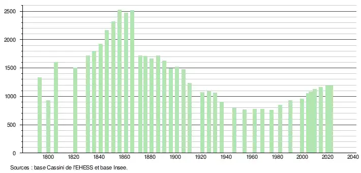 L'évolution du nombre d'habitants est connue à travers les recensements de la population effectués dans la commune depuis 1793. Pour les communes de moins de 10 000 habitants, une enquête de recensement portant sur toute la population est réalisée tous les cinq ans, les populations de référence des années intermédiaires étant quant à elles estimées par interpolation ou extrapolation[14]. Pour la commune, le premier recensement exhaustif entrant dans le cadre du nouveau dispositif a été réalisé en 2004[15].