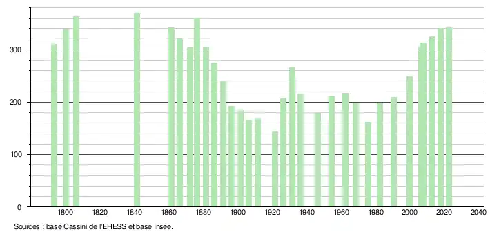 L'évolution du nombre d'habitants est connue à travers les recensements de la population effectués dans la commune depuis 1793. Pour les communes de moins de 10 000 habitants, une enquête de recensement portant sur toute la population est réalisée tous les cinq ans, les populations de référence des années intermédiaires étant quant à elles estimées par interpolation ou extrapolation[20]. Pour la commune, le premier recensement exhaustif entrant dans le cadre du nouveau dispositif a été réalisé en 2007[21].
