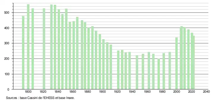 L'évolution du nombre d'habitants est connue à travers les recensements de la population effectués dans la commune depuis 1793. Pour les communes de moins de 10 000 habitants, une enquête de recensement portant sur toute la population est réalisée tous les cinq ans, les populations de référence des années intermédiaires étant quant à elles estimées par interpolation ou extrapolation[14]. Pour la commune, le premier recensement exhaustif entrant dans le cadre du nouveau dispositif a été réalisé en 2005[15].