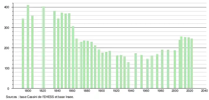 L'évolution du nombre d'habitants est connue à travers les recensements de la population effectués dans la commune depuis 1793. Pour les communes de moins de 10 000 habitants, une enquête de recensement portant sur toute la population est réalisée tous les cinq ans, les populations de référence des années intermédiaires étant quant à elles estimées par interpolation ou extrapolation[16]. Pour la commune, le premier recensement exhaustif entrant dans le cadre du nouveau dispositif a été réalisé en 2008[17].