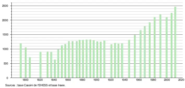 L'évolution du nombre d'habitants est connue à travers les recensements de la population effectués dans la commune depuis 1793. À partir du , les populations légales des communes sont publiées annuellement dans le cadre d'un recensement qui repose désormais sur une collecte d'information annuelle, concernant successivement tous les territoires communaux au cours d'une période de cinq ans. Pour les communes de moins de 10 000 habitants, une enquête de recensement portant sur toute la population est réalisée tous les cinq ans, les populations légales des années intermédiaires étant quant à elles estimées par interpolation ou extrapolation[19]. Pour la commune, le premier recensement exhaustif entrant dans le cadre du nouveau dispositif a été réalisé en 2007[20],[Note 1].