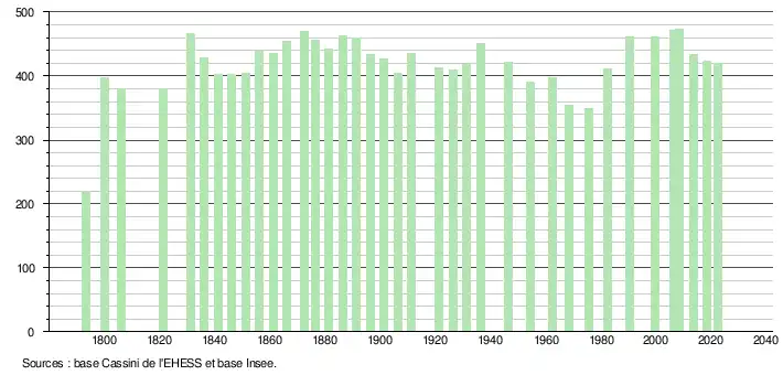 L'évolution du nombre d'habitants est connue à travers les recensements de la population effectués dans la commune depuis 1793. Pour les communes de moins de 10000habitants, une enquête de recensement portant sur toute la population est réalisée tous les cinqans, les populations de référence des années intermédiaires étant quant à elles estimées par interpolation ou extrapolation[70]. Pour la commune, le premier recensement exhaustif entrant dans le cadre du nouveau dispositif a été réalisé en 2008[71].